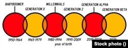 Ljudi rođeni otprilike između 1946. i 1964. nazivani su bejbi bumerima zbog naglog povećanja nataliteta nakon Drugog svetskog rata. Milenijalci koji sada imaju između 28 i 43 godine, dobili su ime po tome što su najstariji pripadnici ove generacije postali odrasli na prelazu milenijuma.