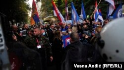Okupljeni su, u jednom trenutku, bacili i upaljenu baklju preko kordona policije, koja se brzo ugasila.
