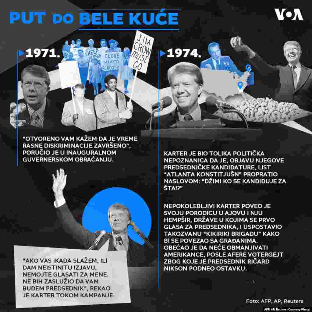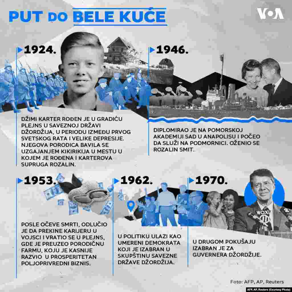 Bivši američki predsednik Džimi Karter, koji je u nedelju preminuo u 101. godini, biće sahranjen uz najviše državne počasti 9. januara. Tog dana biće proglašen i nacionalni dan žalosti, dok će zastave na državnim institucijama biti mesec dana spuštene na pola koplja u čast preminulog predsednika. Karter je bio najdugovečniji američki šef države – koji je u oktobru 2024. proslavio stoti rođendan. ◽Kako je tekao njegov životni put?