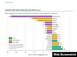 Kada se posmatra stanje sloboda u svetu za prošlu godinu, Kosovo je i dalje delimično slobodno, ali beleži pozitivan pomak u 2022. godini od 4 boda, i u tom jednogodišnjem posmatranju je između Kenije i Slovenije.