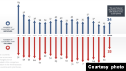 Iz regiona, na listi država u kojima je u poslednjih 10 godina zabeležen dramatičan pad sloboda, na 31. mestu je Bosna i Hercegovina sa minus 10 poena, između Rusije i Indije.