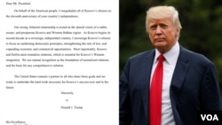 U pismu Tačiju Tramp u ime američkog naroda, čestita svim građanima Kosova 11-godišnjicu nezavisnosti njihove države."Naši jaki bilateralni odnosi temelje se na zajedničkoj viziji stabilnog, bezbednog i naprednog Kosova i regiona Zapadnog Balkana", naveo je Tramp.