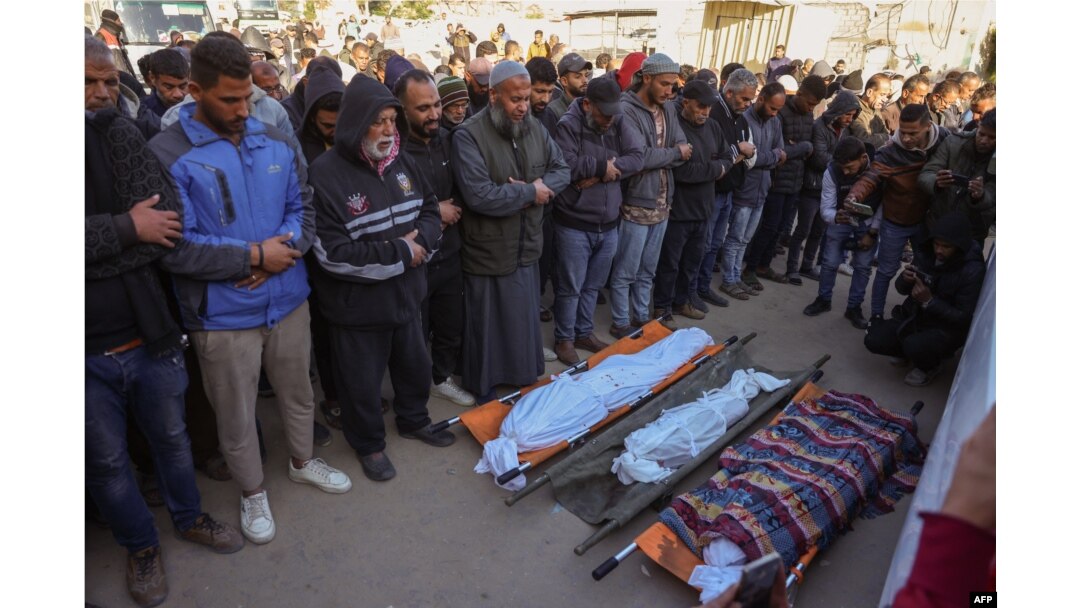 Ljudi se mole pored tela žrtava izraelskih napada na školu koju vodi UNRWA, Ahmad Abdulaziz, u kojoj su trenutno smeštene raseljene porodice, u bolnici Naser u Kan Junisu u južnom pojasu Gaze 16. decembra 2024.